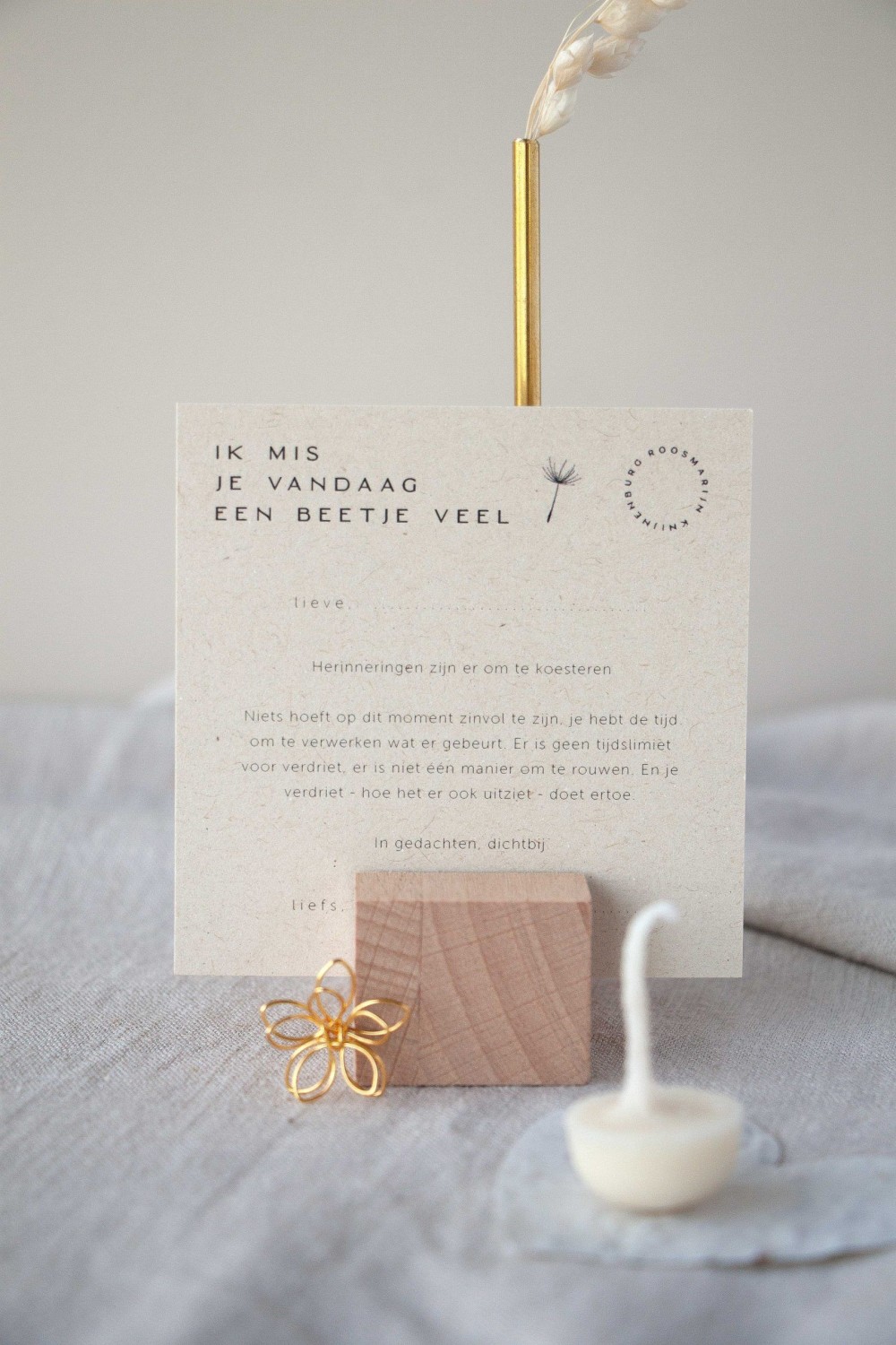De collectie van Roosmarijn Knijnenburg is bijzonder geliefd als symbolisch geschenk. Denk aan troostkaartjes, mini urnen, kaarsen en kleine pakketjes die steun en warmte bieden tijdens moeilijke momenten.