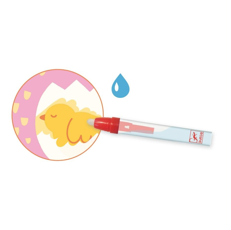 De set bestaat uit 4 tekeningen en een stift die je met water kan vullen.