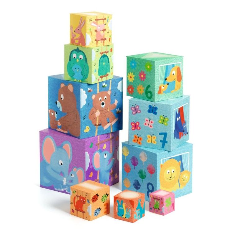 Een stapelspel met 10 kubussen.