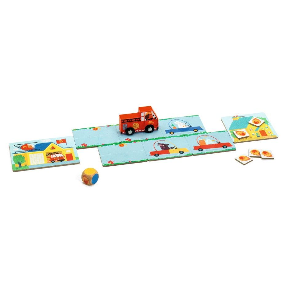 -Inhoud: 1 brandweerwagen, 1 dobbelsteen, 7 brandkaartjes, 12 politieauto kaartjes, 1 huis kaartje, 1 brandweerkazerne kaartje
