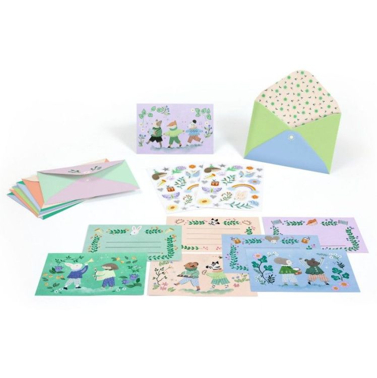 - inhoud: 8 geïllustreerde kaarten (4 kaarten x 2) met lijnen, 8 geïllustreerde enveloppen (4 enveloppen x 2), 2 vellen stickers
