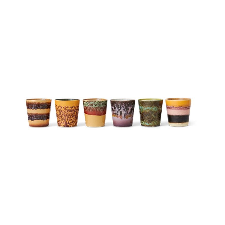 Een set van 6 koffiemokken in diverse kleuren.