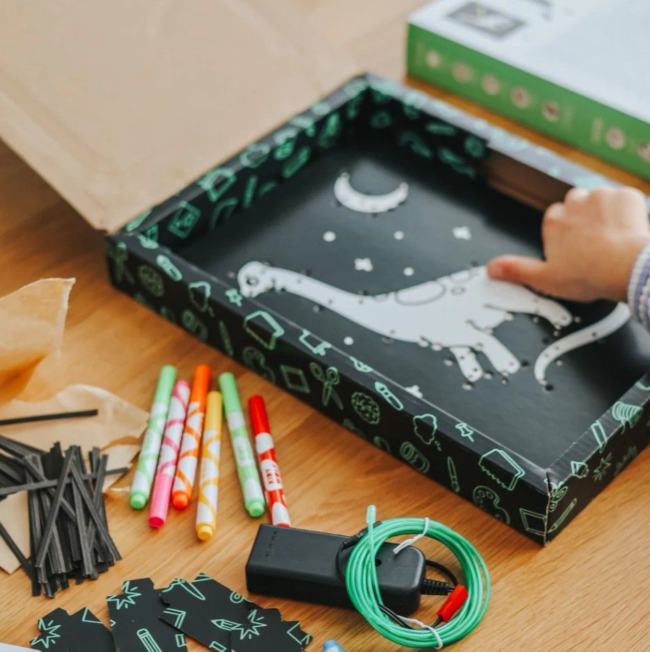Met voorgeperforeerde gaten kunnen kinderen de neondraad weven en zo de dino's tot leven laten komen.