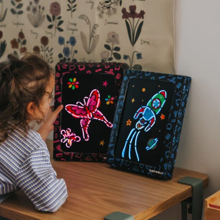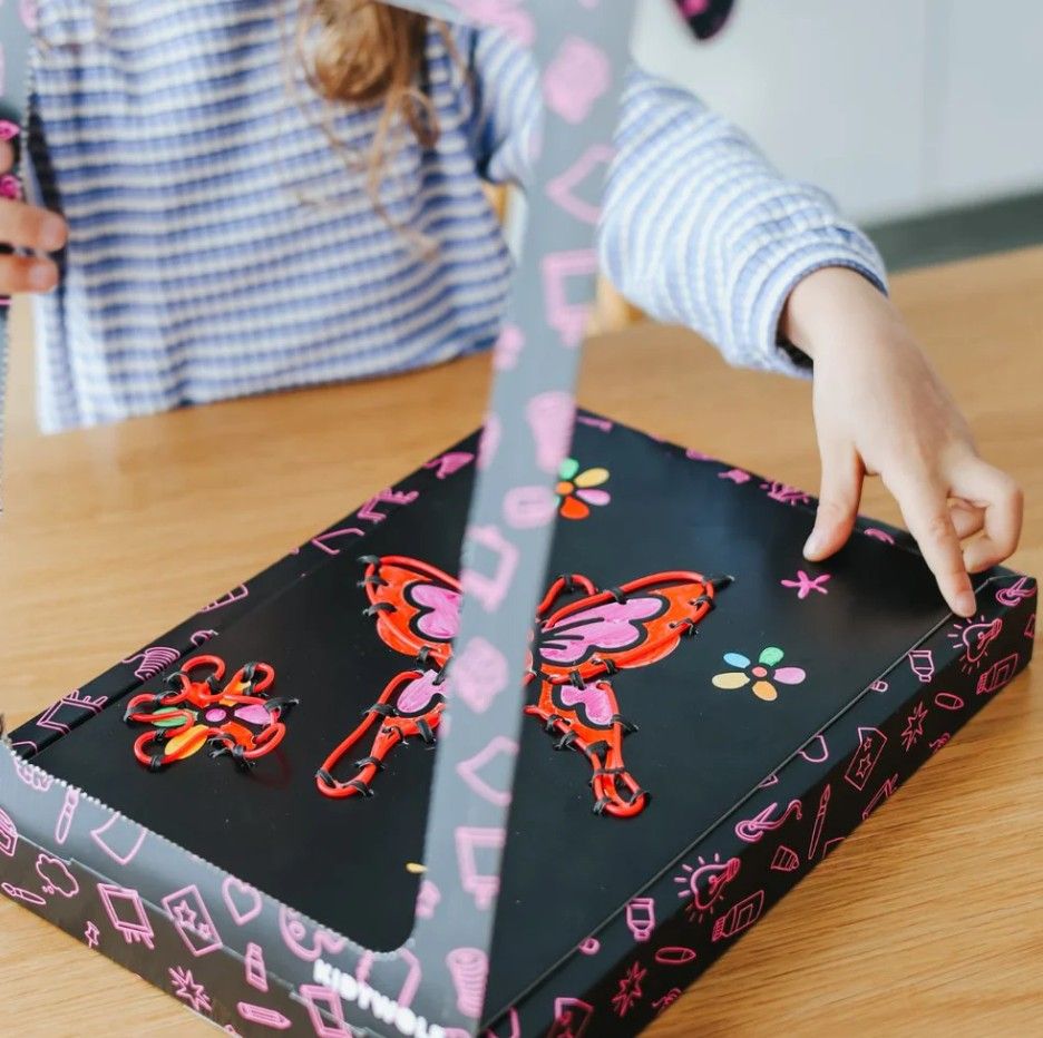 Met voorgeperforeerde gaten kunnen kinderen de neondraad weven en zo een fantasiewereld tot leven laten komen.