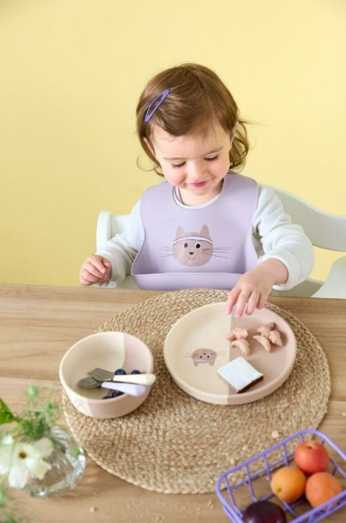 Een handige bowl voorzien van leuke kleurtjes en een ondeugend katje, er is ook een assorti Tiny Team bord van te verkrijgen.