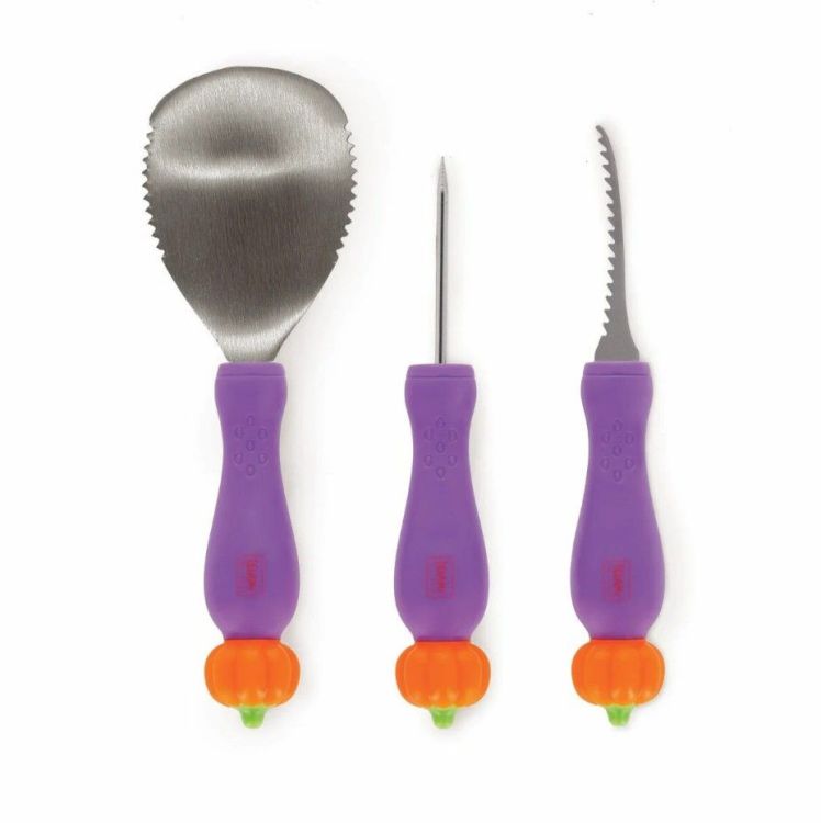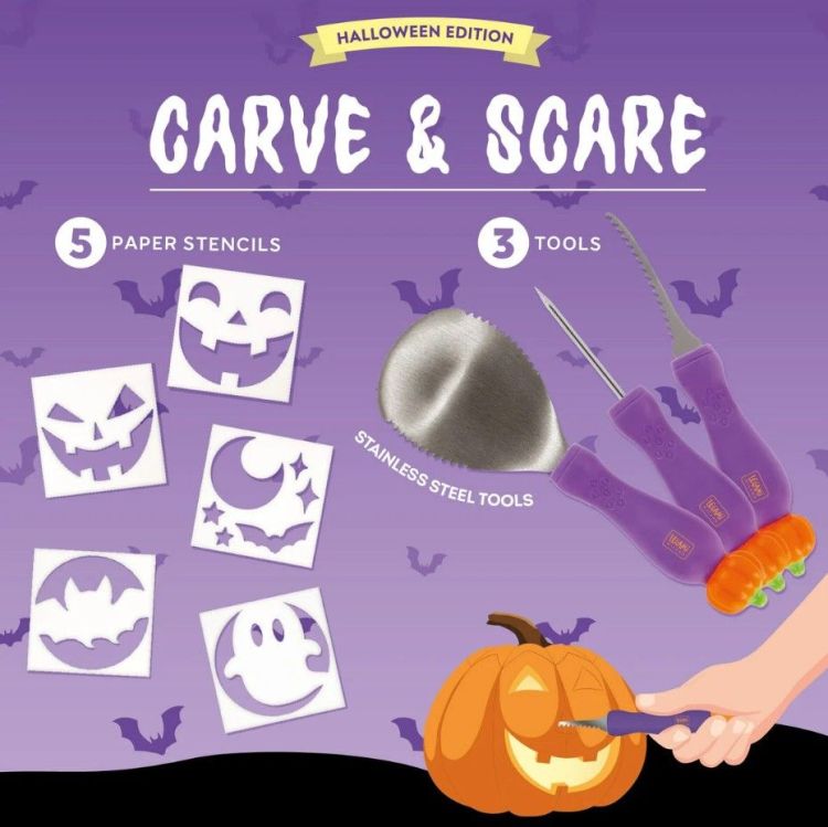 Met zijn 3 mesjes metergonische handvaten en de leuke sjablonen maak jij de mooiste pompoenen.