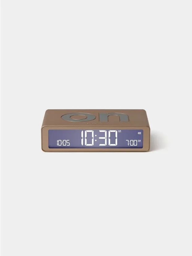 Met de digitale wekker Flip van Lexon zie je in één oogopslag of je de wekker al aan hebt gezet. Ligt de wekker met ON naar boven dan staat hij aan.