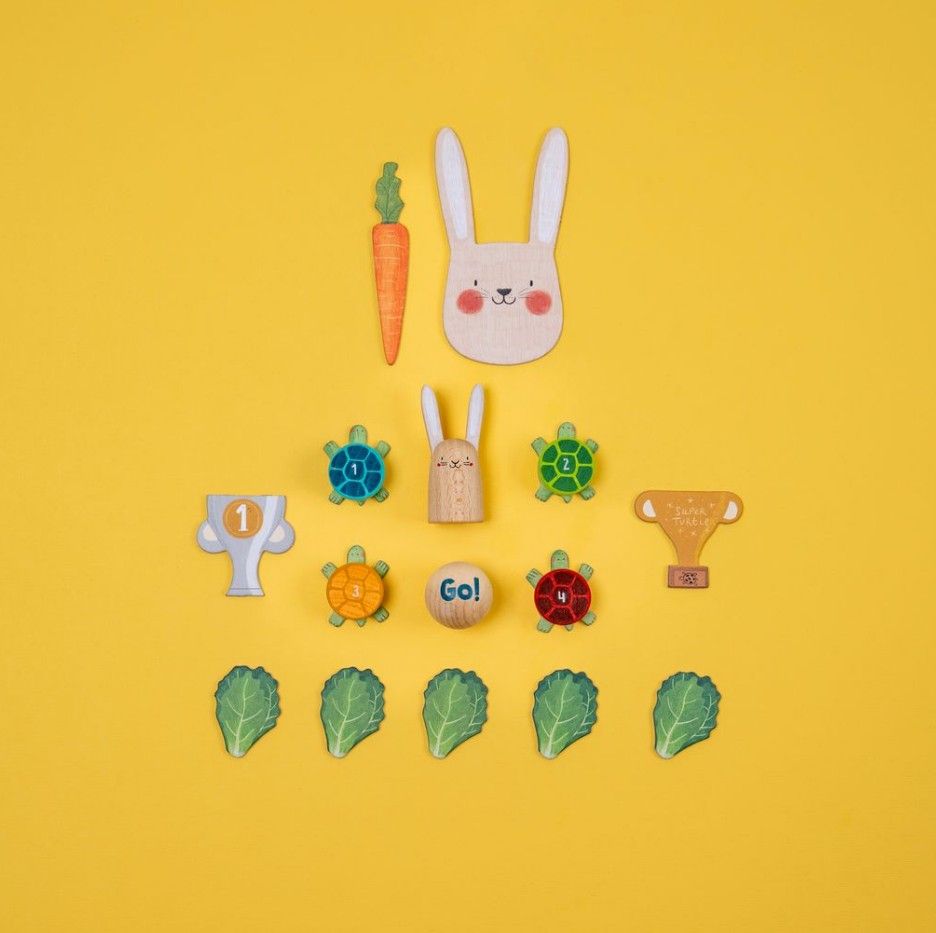 - Inhoud: 1 haas / 4 schildpadden / 1 wortel / 1 kartonnen haas / 20 sla blaadjes / 2 bekers / 4 prijzen / 1 Go balletje
