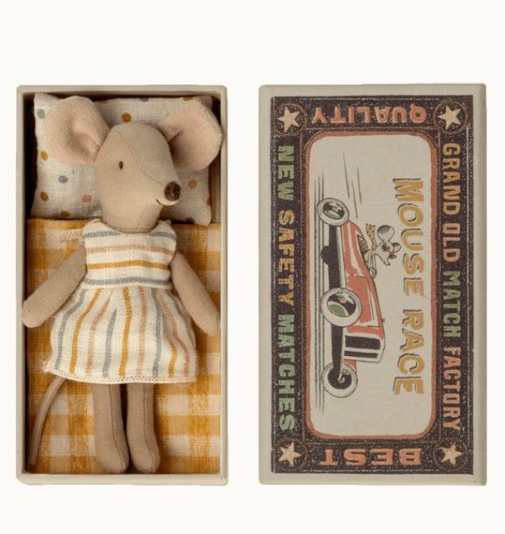 De grote zus muis is klaar voor uren speelplezier en theekranjes. Slaapt in haar eigen luciferdoosje.