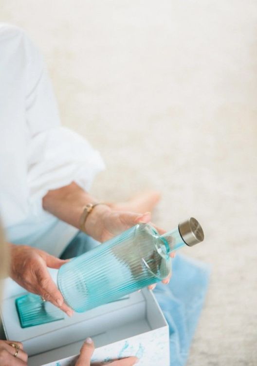 Breng extra kleur in huis met deze mooie set van Paveau met een fles en twee glazen in dezelfde kleur.