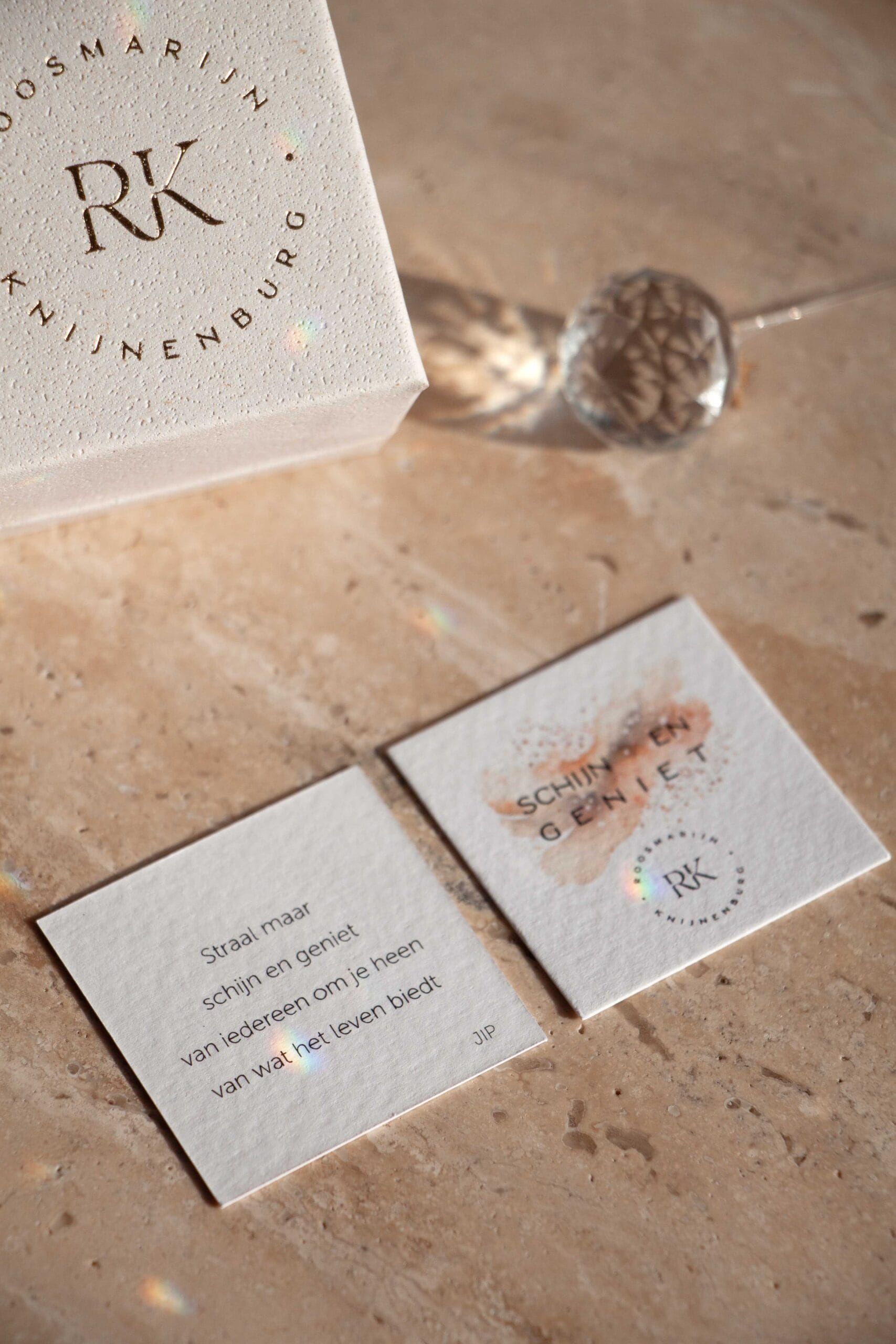 Dit doosje bevat: een kristal met geslepen facetvlakken - dit zorgt voor een prachtige reflectie van regenbooglicht doorheen de kamer - afgewerkt met een gouden sterretje. En een klein kaartje met een gedichtje.
