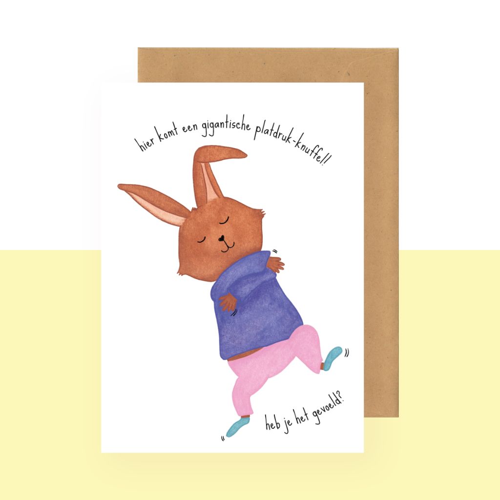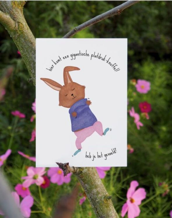 Postkaart - Hier komt een gigantische platdruk-knuffel! Heb je het gevoeld?