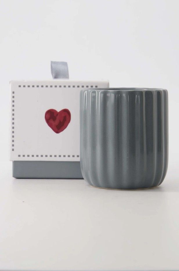 Een lekker ruikende geurkaars van Zusss in een mooi grijsblauyw keramiek potje, afgewerkt met een ribpatroon.