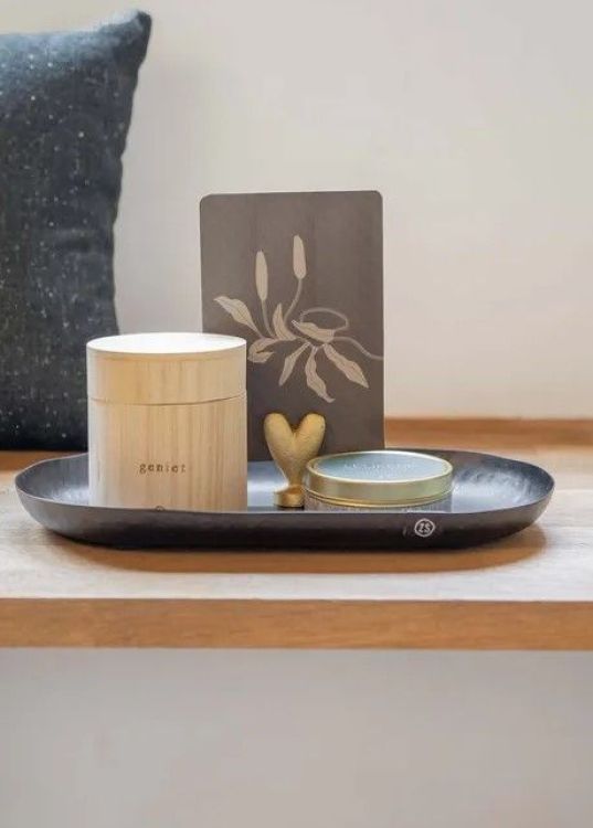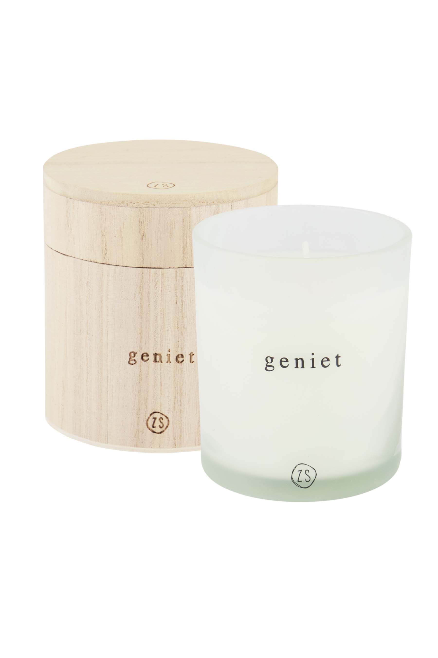Geurkaars verpakt in een mooi houten potje, voorzien van het opschrift "Geniet".