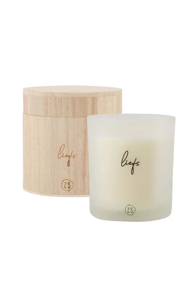 Geurkaars verpakt in een mooi houten potje, voorzien van het opschrift "Liefs".