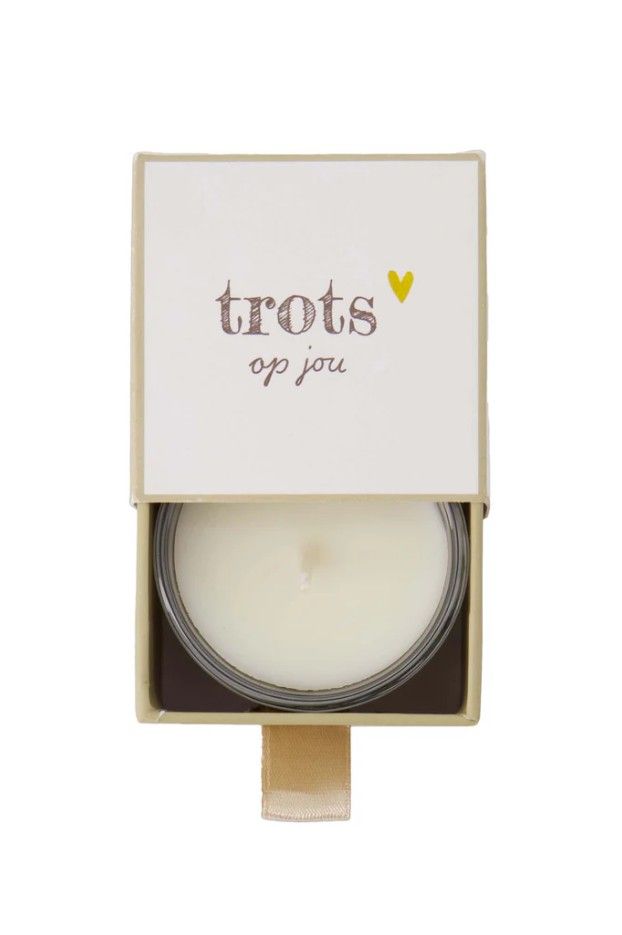 De kaars wordt geleverd in een doosje met het opchrift: "trots op jou". Leuk als cadeautje.