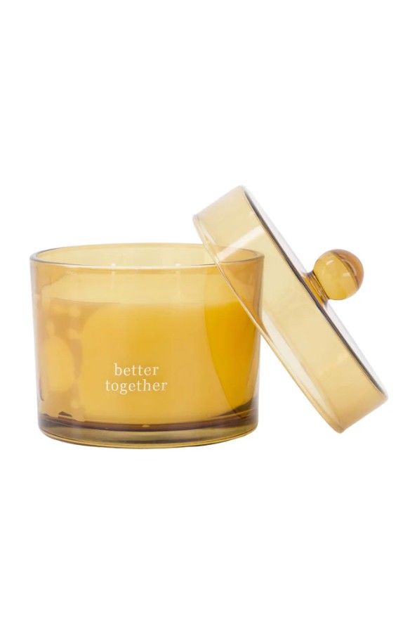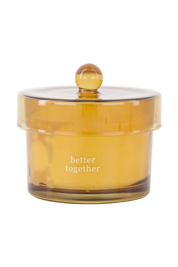 Een lekker ruikende geurkaars van Zusss in een mooi doorzichtig glazen potje, afgewerkt met deksel en het opschrift 'better together'.