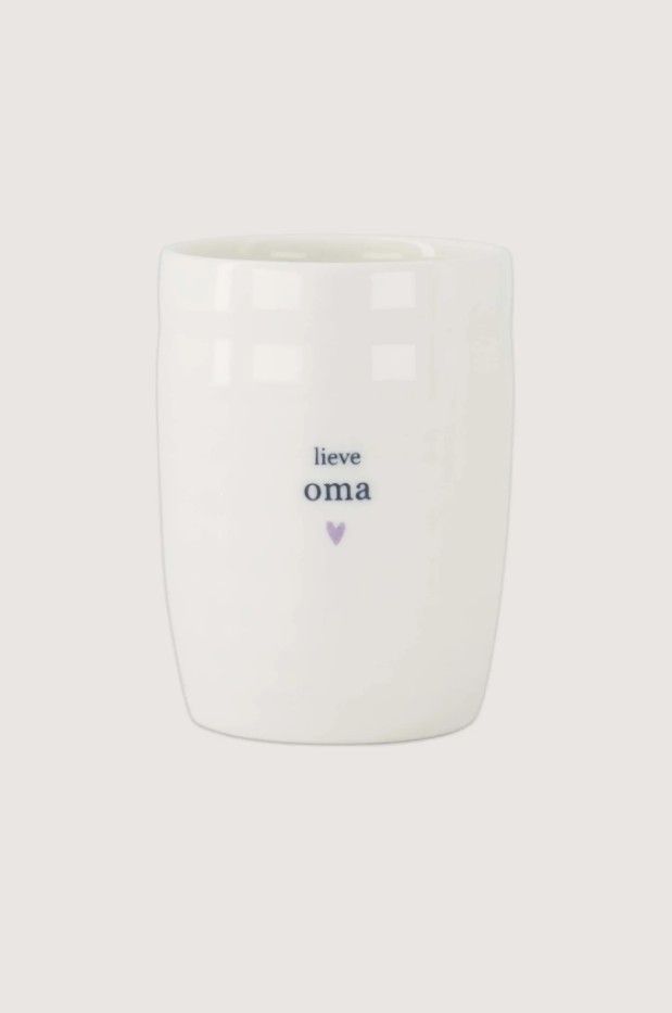 Het mokje is gemaakt van keramiek en is afgewerkt met het opschrift: 'Lieve oma'.
