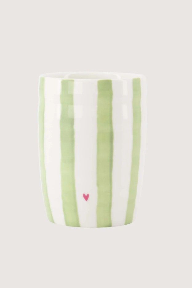 Het mokje is gemaakt van aardewerk en is voorzien van lichtgroene strepen en een fuschia hartje
