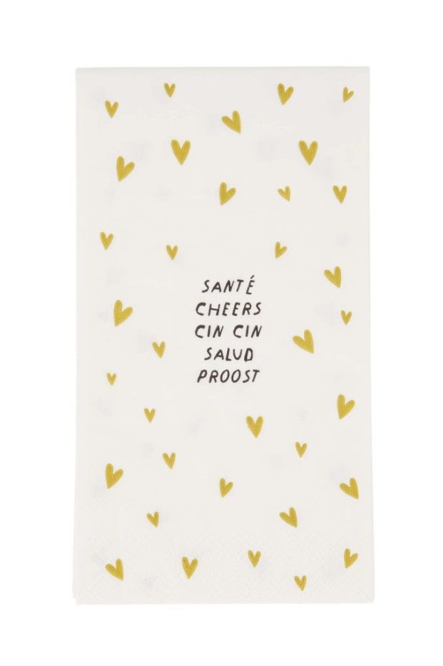 Deze witte servetten voorzien van het woord santé in verschillende talen en gouden hartjes.