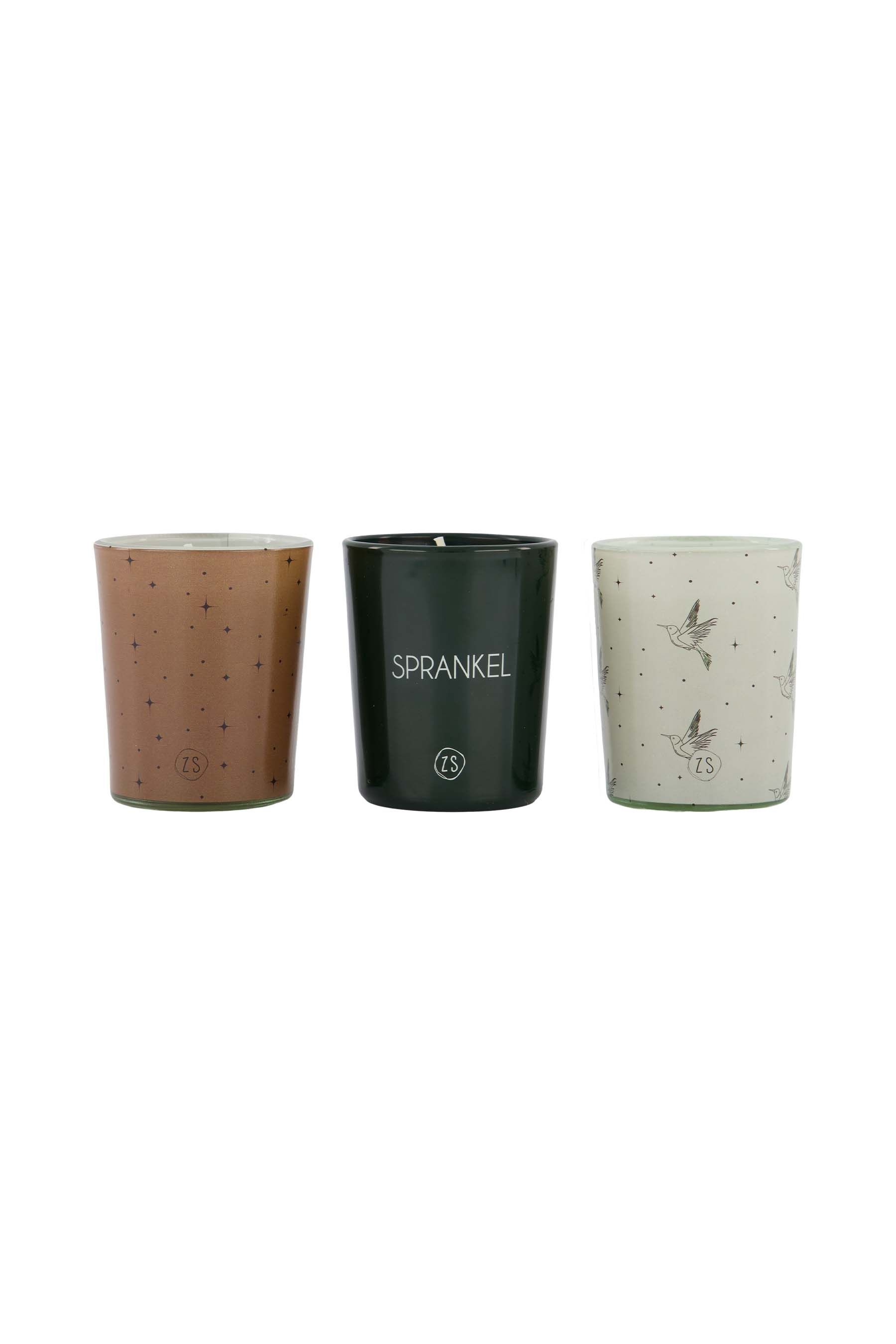De kaarsjes zitten verpakt in een mooi doosje. Op de voorkant van elk glaasje staat een leuk etiket met een tekst of printje.