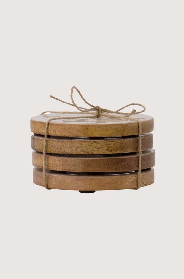 Ronde onderleggers uit de Zusss collectie, vervaardigd uit hout en parelmoer.