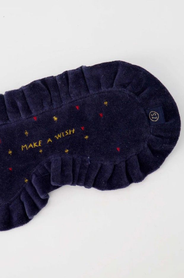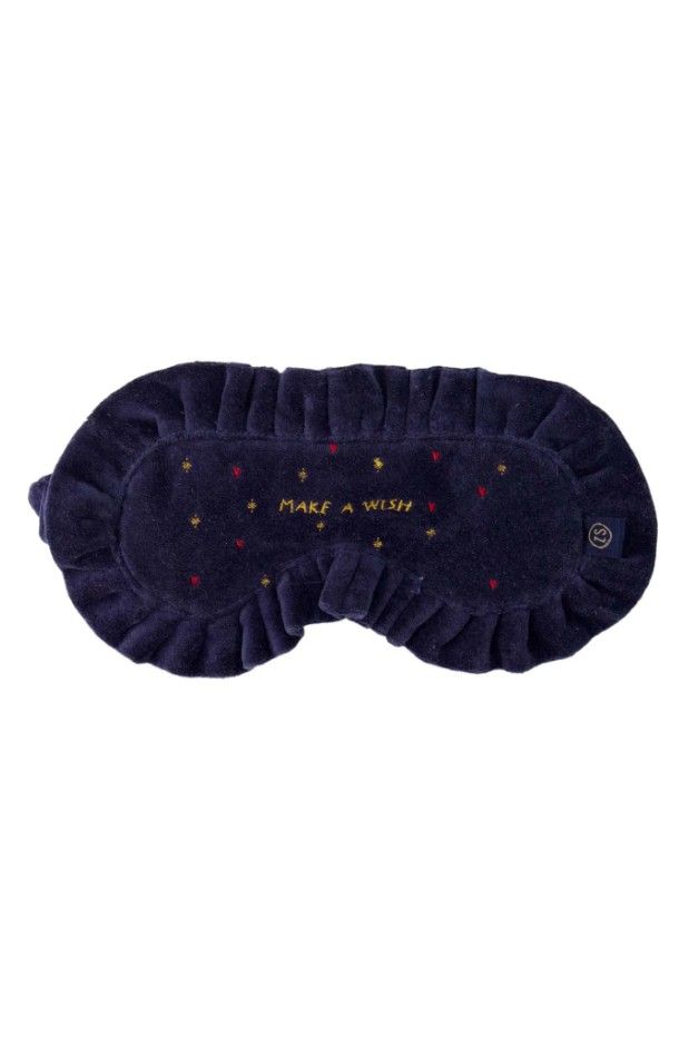 Het donkerblauwe velvet masker is voorzien van prachtige gouden sterren en rode hartjes en de tekst: 'make a wish'.