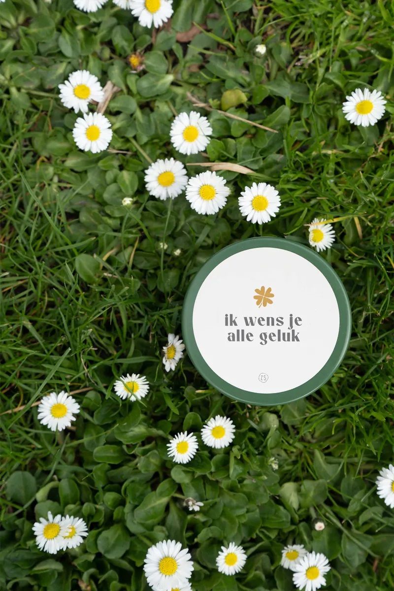 Een leuke geurkaars verpakt in een groen tinnen blikje, voorzien van het opschrift; Ik wens je alle geluk - afgewerkt met een gouden klavertje.